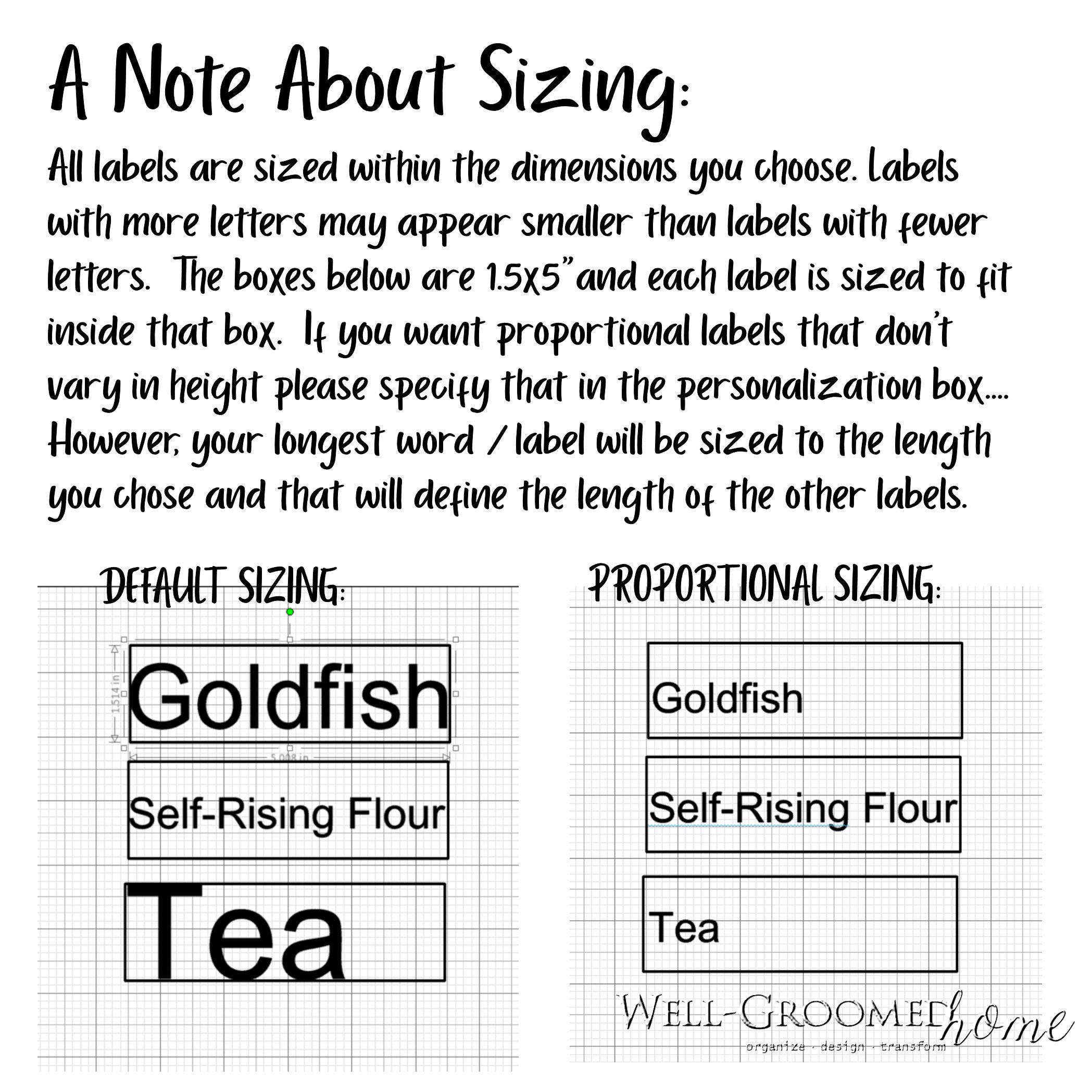 Custom Labels - Standard - SIMPLIFY MY HOME 1. Choose black or white 2. Choose your font - check out each of the images! 3. Select the size of your bundle. 4. Make sure you type each label on a new line - For example: Flour Self-Raising Flour Cornflour White Sugar Icing Sugar Raw Sugar Brown Sugar Caster Sugar etc. 5. Please list the correct number of labels that you have selected
