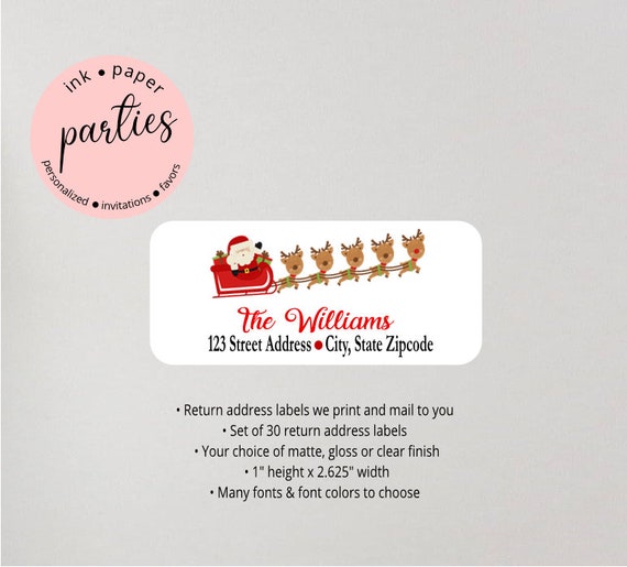 Santa Return Address Labels - Etsy Christmas Holiday Santa Return Address Labels Personalized Custom ~ We Print and Mail to You InkPaperParties (3,972) $4.50 $5.00 (10% off) custom return, address labels, personalized return, address stickers, personalized address, fun christmas, reindeer, snowmen, santa hat shedreamsinink (1,511) $8.09 $8.99 (10% off) Amazon.com: Christmas Return Address Labels Personalized Return Address Labels Simple - Set of 240 Elegant Custom Mailing Labels for Envelopes, Self Adhesive Flat Sheet Rectangle Personalized Name Stickers (White) ... Set 30 Personalized Return Address Labels Merry Christmas Deer Santa Theme Cute Design (White Matte Adhesive) 4.4 out of 5 stars 5. $2.50 $ 2. 50 ($5.91/Ounce) Get it Thu ...
